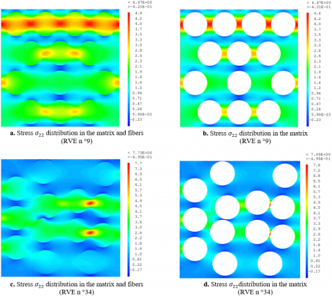 Figures 11a, 11b, 11c and 11d present, as an example, the normal stress distribution $\sigma_{22}$ in RVEs n°9 and n°34 for 0.443 reinforcement volume ratio. Figure 12, as an example, where there can be the areas of stress concentration between the fibers in the matrix area (RVE n°41).