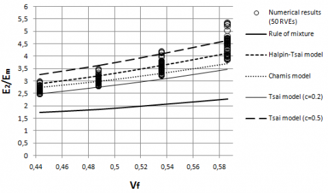 Figure 13 shows the variation of the ratio E2/Em as a function of the volume fraction of the fibers in the interval considered and a comparison between the results obtained by numerical modeling and the values calculated using the analytical models ROM, Halpin-Tsai (with $\xi$=2), Chamis and Tsai with contiguity (with c=0.2 and c=0.5).