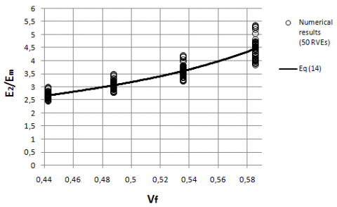Recently, a modified Halpin-Tsai model was proposed by Giner et al. [9], wherein a set of finite element analyses were performed considering randomly distributed unidirectional fibers for different volume fractions Vf and the following analytical expressions have been adjusted to the $\xi$ estimations for random fiber arrangement, Eq. (6):