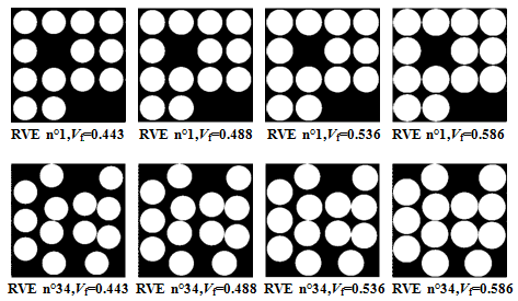 Figure 2. RVEs (n °1 and n°34) for 44.3%,48.8%,53.6 % and 58.6% reinforcement volume ratio