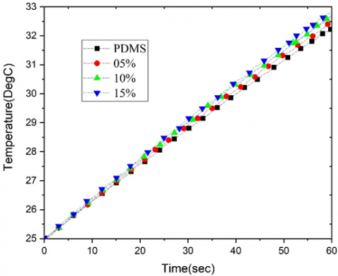 The thermal actuation depends mainly on the beam's material properties and geometry. Polymer composite with a varied volume fraction filler of 5%, 10%, and 15% is considered in the present study. In the case of the heating phase of the composite material, Figure 2 shows that there is an increase in the volume fraction of the filler leads, an increase in the temperature with time-lapse. It is also observed that 15% of the filler content of the polymer surface predicts a higher temperature compared to the plane polymer material.