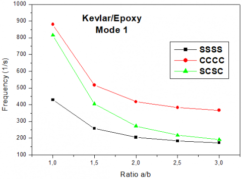 This analysis was performed for a plate with one orthotropic ply of length a=250 mm, width b=100 and thickness of 1 mm. All elastic properties listed in Table 4, were estimated after calculating the homogenized properties by using EasyPBC open-source ABAQUS CAE interface plugin [28], in case of volume fraction of fibers Vf=0.6. The effect of boundary conditions and material type are investigated. The boundary conditions are applied at all four edges of the plate, with simply support (SSSS), clamped boundary (CCCC) and simple clamped conditions (SCSC) as shown in Figure 2. The angular and natural frequencies of the plates have been obtained using Eq. (17) and Eq. (19). The fundamental natural frequency can be obtained by letting m=1 and n=1, (m and n are mode numbers). Using MATLAB, for the first four vibration modes, angular and natural frequencies are computed for all used materials and for applied boundary conditions and listed in Table 5, Table 6 and Table 7. It can be seen in Figure 3, Figure 4 and Figure 5 that the frequency values increase as number of modes increases and that whatever the material, the CCCC plate has the level of highest frequency and the SSSS plate the lowest frequency level, the SCSC plate fall between these two configurations. Also, we can see that the Carbone plate presents the highest level of frequency followed by the Kevlar then glass plate. This can be explained by the high stiffness of the Carbone plate.