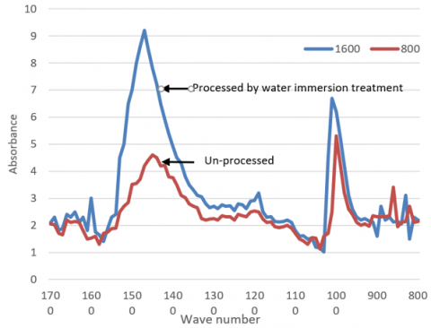 Then a scanning electron microscope (SEM) and an X-ray spectrometer were used to observe the morphology of the cross-section of the waterproof coating and the changes in the void structure, and analyze the element composition of the sample. A surface contact angle meter was used to measure the static contact angle that characterizes the hydrophobic properties of the waterproof coating. A torque rheometer was used to analyze the rheological properties of the waterproof coating and the changes in viscosity under different fine powder particle contents. The drainage rate of the waterproof coating was measured with a stereo microscope. The waterproof material sample was also subjected to infrared analysis, and the infrared spectrogram is given in Figure 1. The peak at around 800cm-1 is the vibration peak of the Si-O bond of the incorporated ultrafine SiO2, its purpose is to improve the breaking strength, adhesive strength, elongation at break, and ageing resistance. The peak at around 1600cm-1 is the vibration peak of the hydrophilic group (-COOH), if there are too many hydrophilic groups, then the water absorption of the material will increase and the water resistance will decrease significantly.