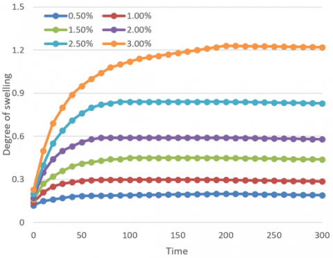 According to Figure 7, in environment with different sulfate concentrations, the situation of the remaining thickness of the waterproof coating layer under the action of the solution was: compared with the solution of other sulfate concentrations, when the sulfate concentration was 1.5%, the loss of the thickness of the waterproof coating layer was greater, and the remaining thickness was smaller, indicating that when the sulfate concentration changes within the value range of [0.5%, 1.5%], the waterproof coating layer swells to varying degrees, and its stiffness is greatly reduced as the swelling degree increases.