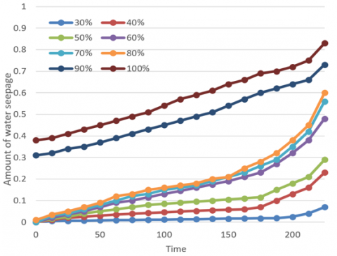 Table 3 lists the durability of the waterproof coating under different normal contact pressures. Figure 4 shows the changes in the amount of water seepage of concrete test pieces under different compressive strain conditions. According to Table 3 and Figure 4, when the strain of the 3mm waterproof coating reached 0.5 or above, the time it takes for the corresponding test piece to reach the waterproof standards specified in Technical Specification for Waterproofing of Construction Engineering had exceeded 3.5 days, and the amount of water seepage hadn’t met the specified waterproof standards, and both the service life and the durability retention rate began to decline.