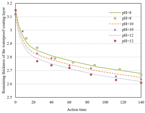 According to Figure 6, under different pH values, the situation of the waterproof coating layer in the solutions was that, compared with the situation of other pH levels, when the pH was 12, the loss thickness of the waterproof coating layer was greater, and the remaining thickness was smaller. This is because after a long-time immersion in the acidic solution, the volume of the coating layer had changed due to swelling, so the structure was more likely to be worn away. Under the long-time action of the acidic solution, the waterproof coating layer reached a thickness of 2mm, which is the critical remaining thickness. Then the durability fitting prediction was conducted under different pH conditions, and the obtained service life of the waterproof coating layer was 37.2 years, 25.0 years, 25.0 years, and 19.8 years, respectively, indicating that when the pH value changes in the value range of [8, 12], the service life of the waterproof coating layer shortens with the increase of the pH value. The structure of the waterproof coating became looser and more easily worn off in higher pH value environment, and the waterproof performance of the material had been greatly affected in later stages.