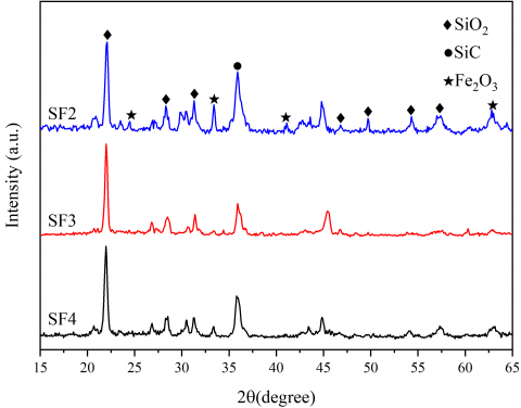 The XRD spectrum of aggregates made of different raw materials is shown in Figure 1, strong and sharp peaks can be observed in the figure, and analysis showed that the main crystal phases of the aggregates after sintering were Fe2O3, SiO2 and SiC. In the aggregates, the magnetic α-Fe2O3 and β-Fe2O3 produced by the oxidation of Fe3O4 play an important role in the absorption of electromagnetic waves. With the increase of Fe2O3 and SiC content, the characteristic peaks of Fe2O3 and SiC were enhanced while no new characteristic peak had appeared, indicating that no new substance was generated, and the composition of the functional aggregates after sintering was relatively stable.