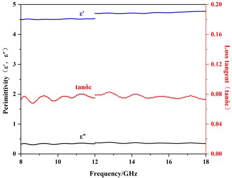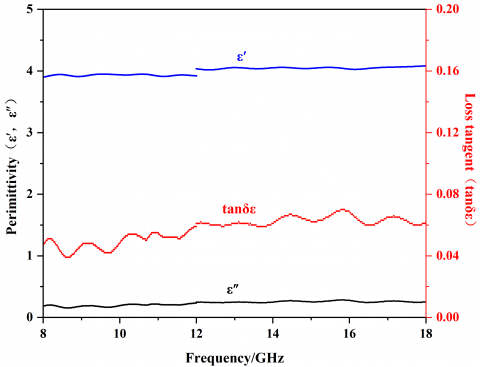 According to the theory of electromagnetism, the imaginary part of the electromagnetic parameters of the material and the tangent angle of the loss are the main factors determining the characteristics of the electromagnetic loss of the material. By testing the electromagnetic parameters of different functional aggregates, analyzing the corresponding laws, and adjusting the composition of the aggregates, we could realize the purpose of adjusting the impedance matching and improving the overall wave-absorbing ability of the material. According to Figure 3, in the test frequency band of 8-18GHz, the real part m′ of the magnetic permeability of the SF2 aggregate was between 1-1.09, and the imaginary part μ′′ was between 0.048-0.074. The tangent angle of magnetic permeability tanδμ was the ratio of μ′′ to m′ [23], and its value was between 0.05 and 0.07. The real part ε′ of its permittivity was between 4.32-4.65, the imaginary part ε′′ was between 0.493-0.689, and the tanδε was between 0.11-0.16. The imaginary part of the electromagnetic parameters of the material and the tangent angle of the loss were relatively large, the aggregates showed a good magnetic loss effect, which was related to the wave absorbing agents SiC and Fe3O4. The real part of the permittivity ε′ of SF3 aggregate was between 3.9-4.08, the imaginary part ε′′ of the permittivity was between 0.153-0.283, and the tangent angle of the permittivity tanδε was between 0.04-0.07. The real part of the permittivity ε′ was between 4.49-4.77, the imaginary part of the permittivity ε′′ was between 0.306-0.391, and the tangent angle of the permittivity tanδε was between 0.07-0.08. By comparing the values of the imaginary part of the electromagnetic parameters and the tangent angle of the permittivity of the three groups of functional aggregates, it could be seen that when the SiC content was between 5%-10% and the Fe3O4 content was between 10%-20%, with the increase of the SiC and Fe3O4 content, the electromagnetic loss effect of the functional aggregates got better, and the electromagnetic loss effect of the SF2 aggregate was the best.