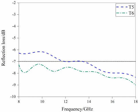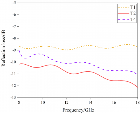 Design of the test boards made of the cement-based composite material is shown in Table 3, and the reflection loss values of the test boards are given in Figure 5(a)-(d). The wave absorption performance can be described by the reflection loss, under the same test conditions, a smaller value of reflection loss indicates that the material has a stronger ability to weaken the electromagnetic wave loss, and it means that the material has a better wave absorption performance. Figure 5(a) shows that in the 8-18GHz frequency range, the reflection loss of ordinary crushed stone concrete test piece T7 was between -3.81dB and -5.35dB, and the reflection loss of ordinary clay ceramsite test piece T8 was between -5.28dB and -6.47dB, indicating that the electromagnetic wave absorption performance of the ceramsite-containing material was better than that of ordinary crushed stone concrete. Inside the ordinary clay ceramsite, the resonant cavities formed by the porous structure can absorb electromagnetic waves through the resonance absorption effect [24], but the two test boards showed low absorption of electromagnetic waves, both cannot meet the civil application requirement (-7dB) for electromagnetic wave absorption. According to Figure 5(b), the reflection loss values of the single-layer and double-layer test pieces T5 and T6 made of the F7 aggregate were -6.16~-8.35dB and -7.26~-9.01dB, respectively. The electromagnetic wave absorption performance of the double-layer test piece had been improved significantly. Related studies suggest that, adding porous materials with lower electromagnetic parameters can effectively reduce the permittivity of the composite material, and the addition of a matching layer can increase the amount of incident electromagnetic waves. Expanded perlite is a high-porosity wave-transmitting material with low electromagnetic parameters, the many pores form a honeycomb shaped-structure inside the material; the matching layer made of this material can decrease the impedance difference between the air and the test board, and reduce interface reflection, thereby improving the impedance matching performance of the test board, which is conducive to the absorption of electromagnetic waves by the absorbing layer. According to Figure 5(c), the reflection loss of the T3 test piece in the 8-18GHz frequency band was -8.71~-9.77dB, and the reflection loss of the T4 test piece was -9.02~-11.13dB. Test results showed that the T3 test piece had the best wave absorption performance. For the cement-based composite material, when the content of functional aggregate and the content of Fe3O4 in the aggregate were kept the same, and the content of nano-SiC in the aggregate was within the range of 0~10 wt.%, the wave absorption ability of the test boards enhanced with the increase of the content of SiC. According to Figure 5(d), the reflectivity of the T1 test piece was -8.52~-8.97dB, the reflectivity of the T2 test piece was -10.14~-12.13dB, when the content of aggregate and the content of nano-SiC in the aggregate were kept the same, and the content of 38μm Fe3O4 in the aggregate was within the range of 0-20%, the wave absorption ability of the test boards enhanced with the increase of the content of 38μm Fe3O4.