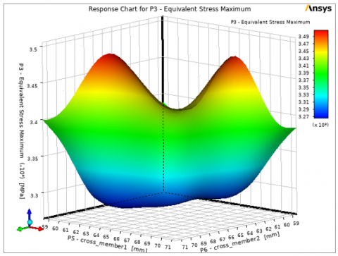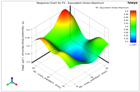 The response surface plot aids to determine the range of values of optimization variables for which equivalent stress is maximum or minimum. The response surface plot of equivalent stress vs cross member 1 and cross member 2 using central composite design scheme is shown in Figure 11. Two peaks of equivalent stress are observed as shown in red colored region.