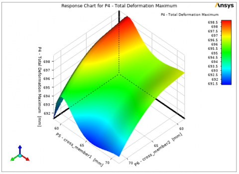 Figure 18. Response surface plot of total deformation vs cross member 1 and cross member 2 using OSFD