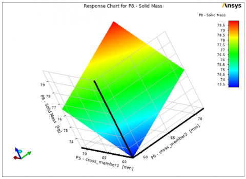 The variation of mass with respect to cross member 1 and cross member 2 for CCD scheme is shown in response surface plot of Figure 17. The maximum mass is represented in red colored region whereas the minimum mass is represented in blue colored region.