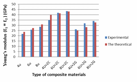 Experimental and theoretical studies indicate that adding carbon fibres to Ultra fibres has a greater effect than adding glass fibres. As the samples formed by adding carbon fibers are stronger and have a lower density. Also, the value of the longitudinal Young’s modulus increased by more than 25% while they have increased and does not exceed 10% when adding fiberglass.