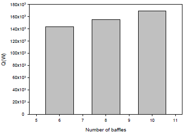 A comparison of the total heat transfer rate between the tubes and the fluid circulated in the shell for the heat exchangers shown in Figure 11. The total heat transfer rate increases with increasing number of baffles, when the number of baffles increases from 6 to 10, the total heat transfer rate increases by 1.08% for the heat exchanger with 8 baffles and 1.18% for the heat exchanger with 10 baffles. With the increase in the baffles number there is an increase in heat transfer coefficient with an increase in temperature which causes an increase in heat transfer rate according to Eq. (4).