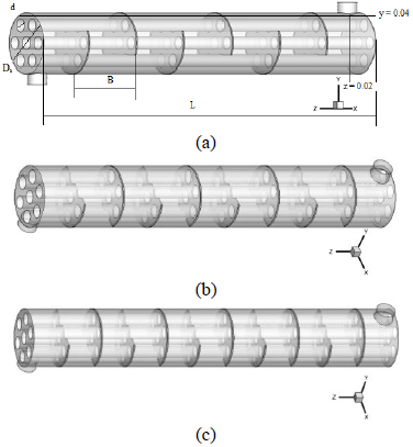 The studied configurations and the thermal coordinate system considered in this study are illustrated in Figure 1. The effects of baffles spacing on the heat transfer and pressure drop for water are investigated for different number of baffles (6, 8 and 10). The geometric dimensions of the problem are mentioned in Table 1 which is taken from the Ozden et al. [15].