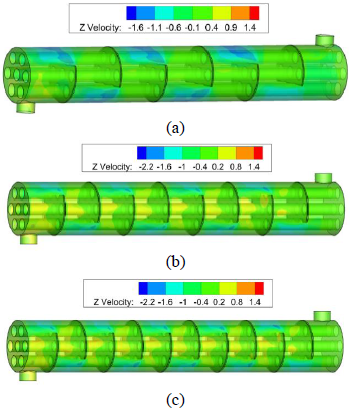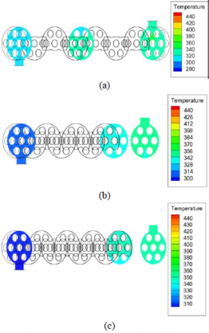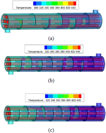 Figure 8 shows the variations in temperature for the three selected configurations, the selected section contains 7 tubes in 3 rows in a shell for further study. For the configuration of 8 baffles the distribution of the thermal field is higher in the vicinity of the tubes and between the tubes of the upper part of the shell.