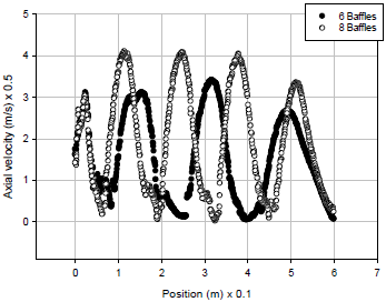 A presentation of the velocity distribution at y = 0.04 m of the two exchangers with 6 and 8 baffles shown in Figure 3. The velocity has a periodic distribution around the central axis and the difference lies in the velocity amplitude because there is an increase in velocity with the increase in the baffles number.