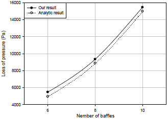 The numerical pressure drop it is found that the higher pressure drop value 15460 Pa for the higher baffle number and that the value of the lower pressure drop 5475 Pa for a reduced number of baffles.
