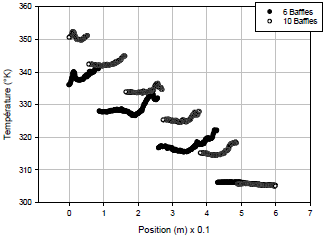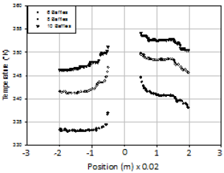Increasing the number of baffles increases the fluid path length and recirculation zones and increases the temperature.