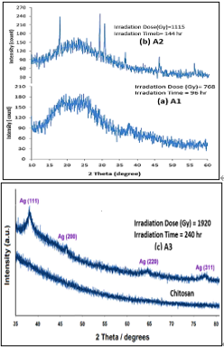 The (111) plane's peak is the most intense of the group. The influence of nanoparticles is mostly responsible for the widening of these peaks. The XRD pattern for (sample A3) There were no substantial indications of other peak phases in their crystalline cubic phase, which suggested the dominant silver. A further consideration is the presence of a nanoparticle of colloidal solution (silver nanoparticles/(CM chitosan - isopropanol)) that exhibited gamma irradiation at 1929Gy doses contributes to the formation of the varied and distinct XRD pattern peaks [56] more than sample A1 and A2. From the XRD pattern, one can conclude the most appropriate gamma dose to get silver nanoparticles due to Co-60 is 1920 Gy and for 240 hr. irradiation dose time [56].