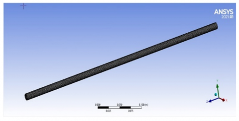 The Ansys program simulated the pipe model of the air conditioning system. Where the surface of the air conditioning pipe was designed with a diameter of 10 mm and a length of 500 mm, representing a general model for air conditioning pipes, where fiber-class and carbon-fiber layers were added in a way that represents each layer 1 mm, where the thickness of the pipe became 3 mm, see Figure 1.
