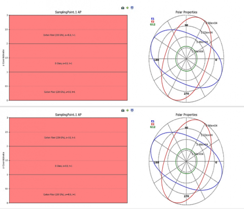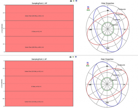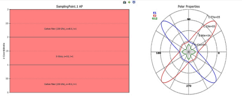 Through the polar properties shown in Figure 6, note that the inverse arrangement does not affect the polar properties, but later on, greatly affects the high distortions and stresses, as note that E1 was 43700 MPa, that E2 reached to 43700 MPa and G12 is 14600 MPa.