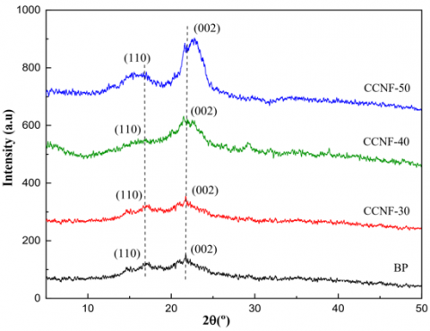 Figure 2 shows the X-ray diffraction patterns of BP and CCNF samples. All materials possess characteristic peaks at 2θ=16.2 and 22.6o, corresponding to the cellulose crystal planes of (110) and (200) [40, 41]. However, the peak intensities of CCNF samples were much higher than those of BP, leading to higher crystallinity (Table 1). In lignocellulosic materials, part of cellulose is a crystal phase, while hemicellulose and lignin are amorphous phases [21, 38]. Therefore, the combination of these three compositions causes low crystallinity (21%). As mentioned before, HNO3 and NaNO2 can convert hemicellulose and lignin into soluble components [29]. Hence, the amorphous phases of hemicellulose and lignin could be removed from BP, leaving solid cellulose fibers with higher crystallinity. When the temperature was raised from 30 to 50°C, the crystallinity of CCNF increased from 40% to 63%. This demonstrates that higher temperatures could speed up the extraction of CCNF from BP.