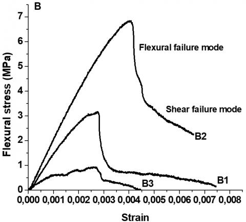 According to this criterion, both flexural and shears failure mode are shown by the stress-strain curves of the studied composites (A and B). According to Figure 4, the B composites first fail in a flexural mode. It means the failure first occurs in the upper and lower composite layers then, a shear failure mode takes place as a result of inter-laminar stress at the neutral axis of the composites. A similar mixed failure mode was observed for the A composites (as shown in Figure 5), when the flexural and shear failure takes place simultaneously. These observations are agreed with those reported in the literature [42-44].