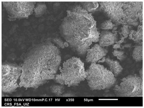 Shell morphology was observed with a SEM analyzer (JEOL JSM-IT100) coupled with a detector of emission of X-rays of type EDXS (Energy Dispersive X-Rays Spectroscopy) which makes it possible, by analysis of the characteristic emissions of the elements, to determine the local quantitative elemental composition of a sample. It presents a maximum resolution of 100 nm. Mussels, like other bivalves, consist of two shells formed by biomineralization of CaCO3 held together with an organic matrix composite of polysaccharides (chitin), proteins and glycoproteins [34], each shell is composed of three parts: the outer layer, periostracum, the middle layer (prismatic layer) and the inner layer (nacre layer) Figure 9. The periostracum which function is to shield the prismatic layer from dissolution by acids and abrasion is unmineralized and composed mainly of protein [35], the prismatic layer consists of parallel calcite prisms [34] and the inner layer (Nacre layer) which could be classified as a biomineralized composite [35] is composed of laminar aragonite [34]. The detailed SEM microphotography of the mussel shell is illustrated in Figure 9.