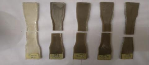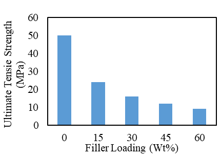 The results of the tensile strength test are respectively summarized in Figures 2 and 3. Figure 2 shows the layout of the specimens after the tensile test, while Figure 3 shows the influence of variation in loading of filler on the tensile strength of the prepared metakaolin/epoxy composites specimens. It is clear from the figure the decreasing of ultimate tensile strength with increasing loading of metakaolin filler because of the poor interfacial adhesion or particle agglomeration and This may be due to the irregular distribution of particles of metakaolin in the epoxy matrix. Also, the metakaolin particles brittleness causes the local stresses concentration at the particles which leads to the tensile strength deterioration of the compound. This behavior may happen to the composite's specimens due to the affect of the fracture stress that causes cracks to appear. So microcracks join collectively to a macrocrack, which, becomes unstable at critical stress levels causes barrier to the stress transition. The same results were obtained and reported in the study [21].