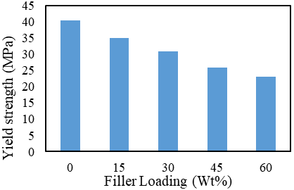 The effect of adding of metakaolin filler on the composite specimens yield strength is shown in Figure 8. It is shown that the all epoxy compounds yield strength decreases with the increasing in the proportion of metakaolin. This can be explained by the mechanism of plastic deformation whereas the most deformation occurs in the epoxy matrix phase. Besides this phenomenon, the metakaolin rigid particles filler presence cause restricted the motion of the chain of the molecular to pass each other, thus resulting brittle failure so particles are responsible directly for the decrease in the value of the yield strength. The obtained results agree well with that reported in the studies [27, 28] respectively.