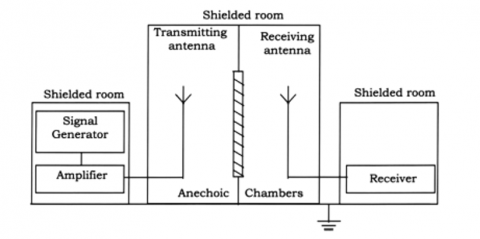 The method of the shielded room is a sophisticated method that involves comparing the measurement of the different shield materials. The signal generator, recorder, transmitting and receiving antennas are placed respectively in different rooms to avoid such interferences. Furthermore, the size of the test specimen can also be increased since the antennas are placed in an anechoic chamber of increase size [6].