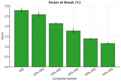 Mechanical properties of the composites revealed a decreasing trend of tensile strength of the composites with increasing DPS content with values of 43.95 MPa for neat UPS and 30.00 MPa at 40% DPS. On the other hand, the tensile modulus of the composites was found to have risen from 22.65 MPa for 0% DPS to 33.54 MPa at 40% DPS, which showed that the formula matrix stiffness was enhanced by the presence of rigid filler particles. Strain at break also decreased, from 2.91% (neat UPS) to 1.39% at 40% DPS, confirming reduced ductility with higher filler content.
