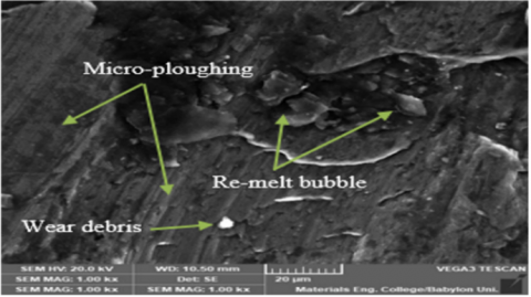 According to the SEM images of the MA, Al-Y2O3, and/or SiC MMCs alloy shown in Figure 10, the worn abraded surface was parallel to the sliding direction. The abraded surface of the MA alloy (Figure 10(a)) showed significant material flow and distortion, demonstrating the adhesive wear process. Figure 10(b) illustrates how detached wear debris caused scratches and cutting, also known as micro-ploughing, which resulted in deeper grooves in the sliding direction and re-melted bubbles. In Figure 10(c), the surface tribo-layer, suggested as the protective layer, showed a reduction in weight loss. Figure 10(d) reveals the microstructure of the Al-Y2O3/SiC composite, where the combination of Al-Y2O3 and SiC particles contributes to the enhanced wear resistance and reduced deformation compared to the individual components. The wear behavior was also affected by the Al-SiC interfacial strength. As seen in Figure 10, a stronger interfacial may lead to improved wear resistance.