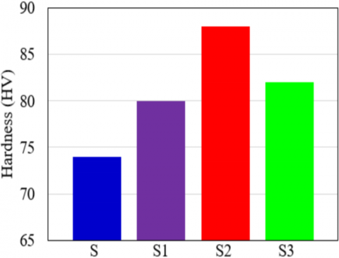 An optical micrograph of MA and Al-Y2O3 and/or SiC MMCs at different reinforcing levels is displayed in Figure 4(a). The microstructure indicated that the reinforcing particles were distributed uniformly throughout the base material Al alloy. This was attributed to the effectiveness of the vortex movement as well as the adoption of an appropriate composite production technique. The reinforcement particles were found to cluster in all samples (S1-S3) since each composite had the same number of reinforcements. Clustering is influenced by Size, quantity, and stirring time during the stir casting process. Four samples are made up of five percent each of Y2O3, SiC alone, and hybrid (Y2O3 and SiC together). Due to the same amount of reinforcement is applied throughout the sample, the clustering is essentially equal.