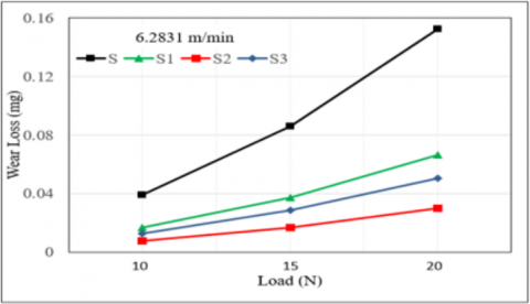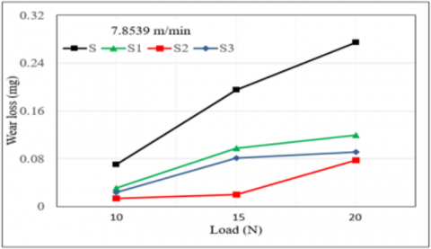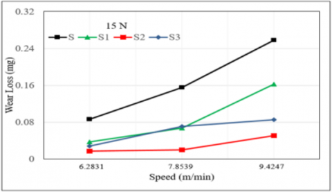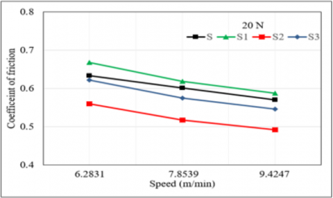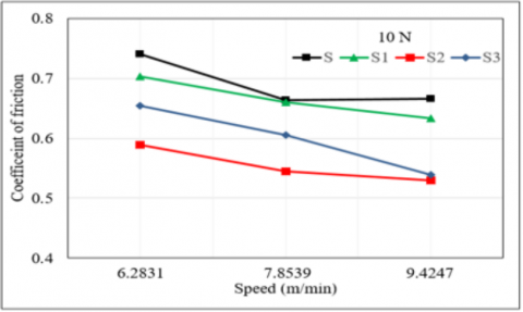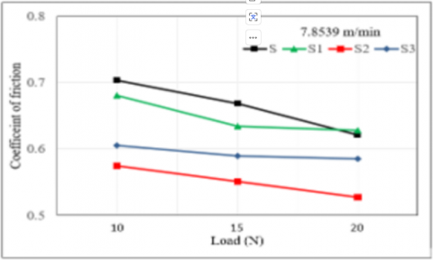 Figure 6 illustrates how the CoF of MA, Al-Y2O3, and/or SiC MMCs changes with applied normal load. The figure shows that the CoF generally falls for all alloys as applied normal load increases. Typically, when the pin slips on MA or S, it displays a high CoF. This is MA's main flow, which may be fixed by altering it by adding SiC and Y2O3 either independently or combined. Al-Y2O3 and/or SiC MMCs display a decrease in CoF as the applied load increases in comparison to MA. According to Natarajan et al., this could occur as a result of a transfer layer forming at the contacting surface [25]. The figure illustrates the effect of rising hardness on reduction of CoF, as the result of comparing four alloy MMCs. It seems natural that friction will decrease as the hardness increases. CoF varies with sliding speed for different applied normal loads, as seen in Figure 7. With the change in loads, the CoF exhibits the same behavior as previously explained, according to the schematic, and for the same reasons.