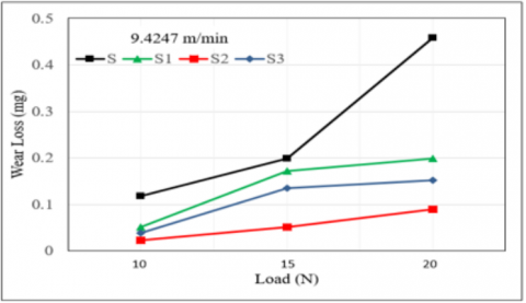Figure 8. wear vs. applied load for different sliding speed: (a) 6.2831 m/min, (b) 7.8539 m/min and (c) 9.4247 m/min