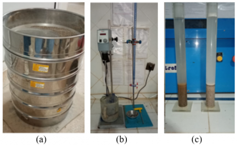 Figure 4. (a) Granulometry analysis, (b) methylene blue adsorption test, (c) sand equivalence evaluation