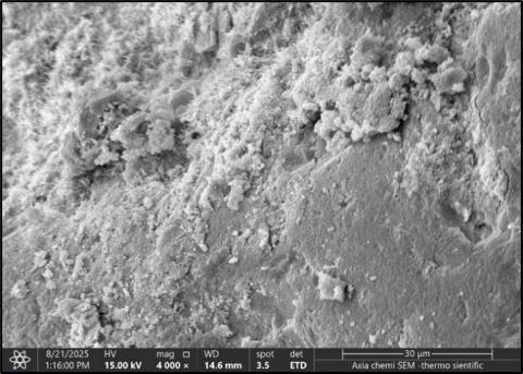 Figure 7, on the other hand, shows the influence of NFA, with a mean particle size of less than 100 nm, which has significantly more vigorous pozzolanic activity, producing more Calcium Silicate Hydration and a more densely loaded microstructure at both the micro- and nanoscales. The nanoscale filling of voids is successful in reducing porosity and microcrack formation, and in enhancing hydration kinetics. Therefore, NFA has a significant positive effect on the strength performance of cementitious paste, tensile, compressive, and rupture strengths of the sample, and long-term durability despite being used at low replacement levels (1-6%), which is higher in comparison with the control group and the sample used in MFA.