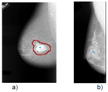 Figure 1. Examples of a) a pathological region and b) a normal case