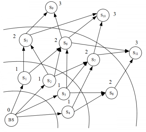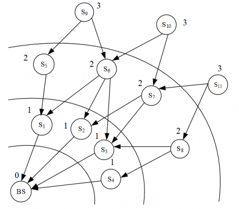 Sometimes, the message may be received by a cluster head within the same ring of the broadcaster or in a ring close to the base station. For example, if S3 receives the message from S2, it will not be added to the set of neighboring cluster heads of S2, because S3.RID<S2.RID+1. The same process is executed by each cluster head. In this way, each cluster head can establish its own set of neighboring cluster heads.