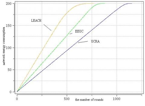 Through the simulation, the authors mainly compared UCRA, LEACH and EEUC based on how the network energy consumption and number of dead sensors changed with the growing number of rounds.