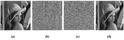 Figure 3. Experimental results with Lena image, (a) original image, (b) compressed image, (c) encrypted image, (d) decrypted image