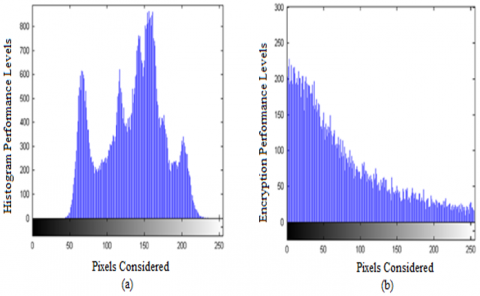 Histogram of Lena image is presented in Figure 4 to analyse image encryption performance. When histogram of encrypted image shows values in uniform distribution, it reflects good performance. Figure 4 (a) and Figure 4 (b) show histogram of Lena and its encrypted image respectively. It is found from empirical study that histograms of different input images are similar in order to confuse attackers.