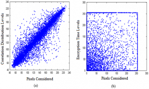 As presented in Figure 5, the correlation distribution of pixels in Lena image and its encrypted counterpart are shown. Correlation shown relation between two adjacent pixels and 1 indicates higher level of correlation and 0 indicates least correlation. Eq. (9) is used in order to perform correlation measure by using 16000 randomly selected adjacent pixels from both images. Least correlation between adjacent pixels shown in Figure 5 (b) reflects performance of the proposed method.