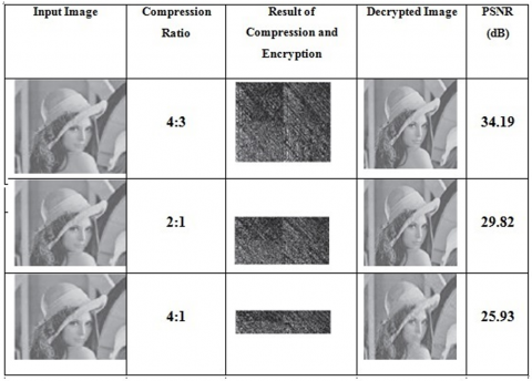 It is used to find quality of decrypted images with various compression ratios. By measuring PSNR the quality of the proposed encryption technique can be estimated.