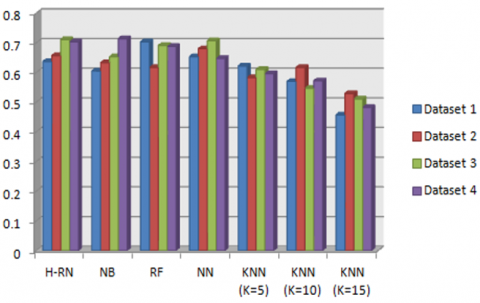 Each cell above (Tables 13 and 14) shows the error test of each studied algorithm. Both MAE and RMSE express average model prediction error in units of the variable of interest. Both metrics are negatively-oriented scores, which means lower values are better. On average, the actual RMSE error is 1.58% higher for H-RN and 1.61% higher for KNN with k=10. However, the smaller value of the RMSE is returned by HRN in datasets 3 and 4 with 1.40 and 1.51 respectively by comparing KNN, NN, and NB.