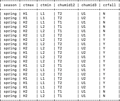 Also, the months have been splitted into seasons, shown below (Table 1) and the attribute crfall has been splitted into Y and N, if crfall is greater than 0 and less than 0 respectively [14, 15].