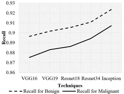 Figure 6 shows that the recall of Inception performs better by 2.99%, by 2.39%, by 1.98%, and by 1.4% respectively than VGG16, VGG19, Resnet18, and Resnet34 for Benign. Also the recall of Inception performs better by 3.6%, by 2.7%, by 2.32%, and by 1.42% respectively than VGG16, VGG19, Resnet18, and Resnet34 for Malignant.