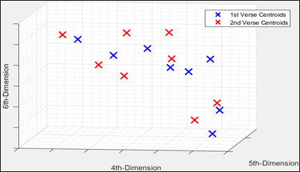Codebook matching is defined as the process of searching in the reciters’ database to identify the current reciter. First, one retrieves a codebook from the reciters’ database and matches it with generated codebook. The generated codebook for the Holy Quran reciter is compared with all codebooks stored in the reciters’ database. Each centroid in the generated codebook is coupled with its nearest centroid in the retrieved codebook. These two codebooks would be from different verses of similar or different reciters. The purpose of this step is to measure the matching error between the two codebooks based on the total SED between the coupled centroids. So, if the total SED is less than the threshold criteria, the reciter of the retrieved codebooks would be considered a candidate reciter for the generated one and added to a reciters’ candidate list. After comparing the generated codebook with all codebooks in the database, the reciter with the lowest matching error in the reciters’ candidate list is considered the reciter for the input signal. If the reciters’ candidate is empty, then the reciter of the input signal is considered unknown.